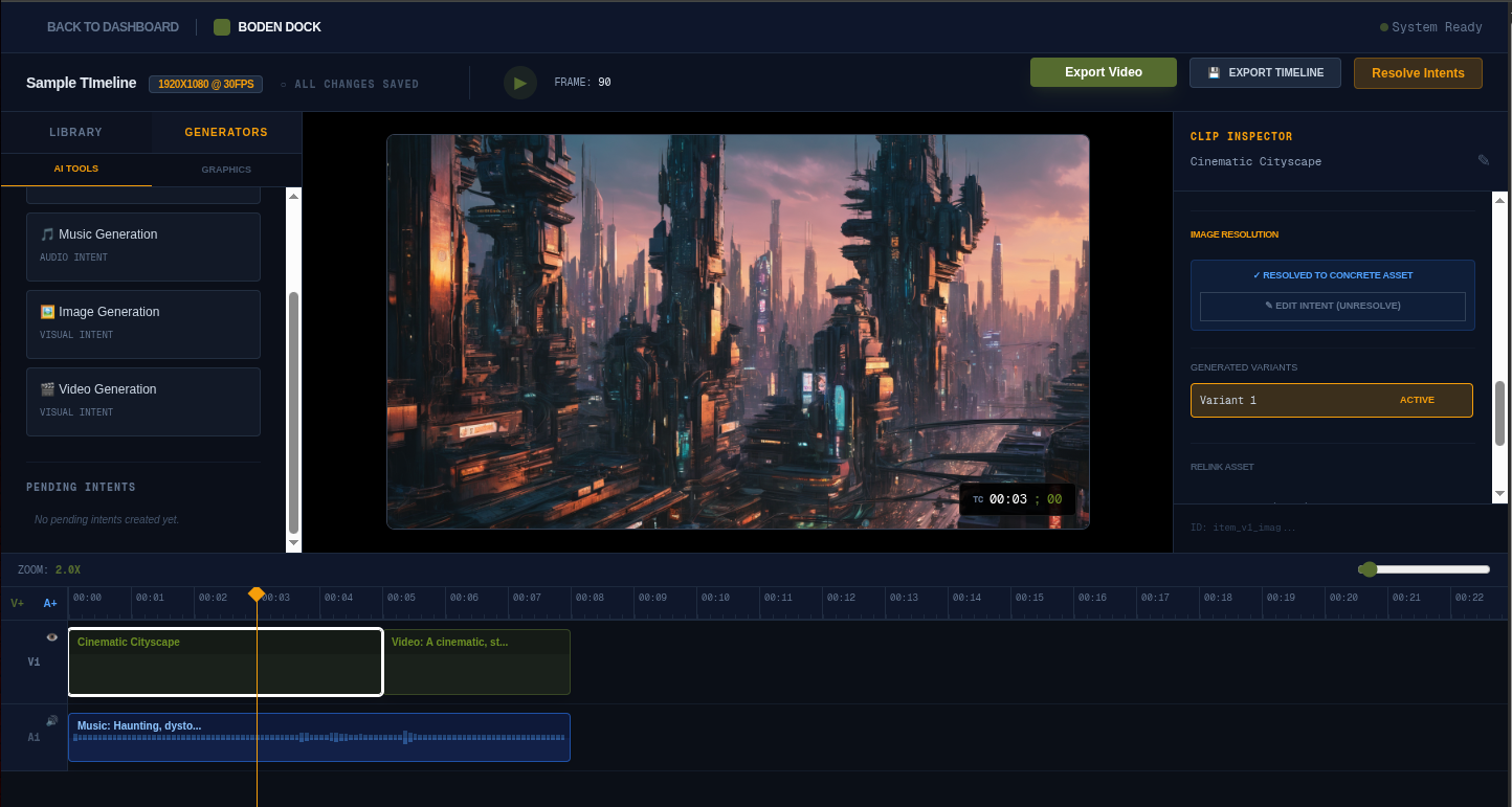 Every item in your project is a first-class data object. Define keyframes for scale, position, and opacity, or set prompts for the resolution engine to handle.